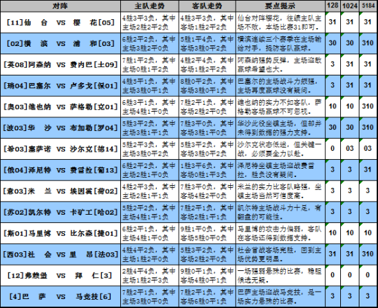 两场日职赛事都不是强弱分明的对阵,仙台本赛季的排名不佳,但近来走势有起色,坐镇主场迎战樱花,往绩从未输过,心理优势巨大,看来本场比赛也可确保不败之身;横滨和浦和目前只有1分的差距,榜首的广岛则和横滨同分,在很大程度上本场比赛将影响本赛季的冠军归属,可惜过去三个赛季横滨全部在主场输给浦和,客队心理优势巨大,吧排除本轮再胜的可能性。