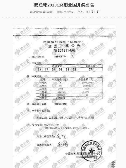 北京时间2013年09月29日晚,中国福利彩票[微博]双色球[微博]第2013114期开奖结果产生,当期奖号:红球 04 06 17 21 23 33,蓝球 07。一等奖开出5注1000万,二等奖开出97注,单注奖金38万余元。5注头奖分落黑龙江、江苏、河南、四川和山东。本期销量3.98亿元,计奖后奖池攀升至2.4亿元。[提醒:新浪网友近期频频中出双色球巨奖,你也来试试手气?新用户充值50送20元!]