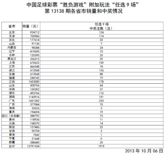 北京时间2013年10月6日,胜负彩13138期任九场开奖结果揭晓:共中出1919注头奖,每注奖金4265元,销量12,791,334元。新浪投注平台方面,共中出110注二等,其中有网友[完美弧线1943]以及[小锤子66]仅用64元小单便揽获头奖![查看过关统计]
