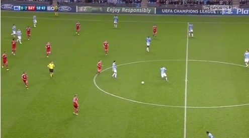 要想在小范围内传球和控球,球员出众的技术能力自然是首要因素——里贝里、克罗斯和格策的三人配合或许会水银泻地,但我们永远无法指望冯仁亮、赵旭日和郑智们完成同样的事情。除了技术做基础,无球跑动也是小范围传控能否顺利实施的重要因素。下图中,拜仁得以在中路通过两个三人间的配合后打到曼城[微博][微博]腹地,罗本连续的无球跑动至关重要。他在此次进攻中扮演了轴心的角色,用自己的无球跑动为队友创造传球空间,并引领攻势。