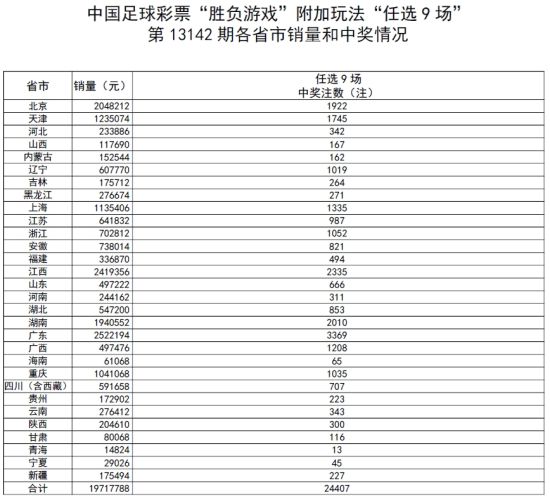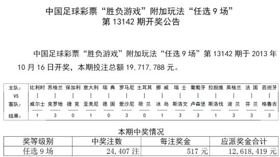 北京时间2013年10月16日,足彩[微博]胜负彩13042期任九开奖结果揭晓,本期足彩仅意大利和比利时冷平,其他强队如期获胜。任九略显平淡,共开出24407注,单注奖金517元。[猜国家队足彩2元中头奖 新用户充20送10元]