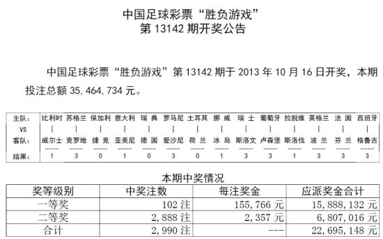 北京时间2013年10月16日,足彩[微博]胜负彩13142期开奖结果揭晓,本期足彩仅意大利和比利时冷平,其他强队如期获胜。但在3546万销量的保障下,头奖依然开出105注15万余元。二等奖开出2888注2357元。任九略显平淡,共开出24407注517元。