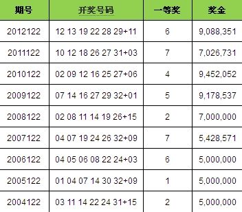 5.从2003--2012年,双色球122期有9次开奖,同尾数有7次,19-29、02-12、07-27、04-24(2次)、04-14、11-31组合,234尾数疯狂,尤其是4尾号码。