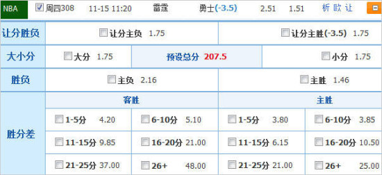 大小分:大分(207.5) 胜分差:主胜6-10分/11-15分