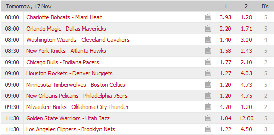 北京时间11月17日NBA将进行11场比赛,火箭结束背靠背之旅回到主场迎来本赛季实力下滑的丹佛掘金。而在东部将上演强强对话,公牛将在主场迎接步行者的挑战。本轮还有一场焦点大戏便是篮网对阵快船[微博],但因为篮网本赛季的表现让人失望,本场比赛虽然会有不小的关注度,但未必会打出真正紧张刺激的较量。而从目前的赔率分布来看,勇士对阵爵士的比赛是明日的首选胆材,爵士胜赔达到12.00,勇士仅为1.04,勇士连胜值得期待。【投注篮彩,支持你的主队】