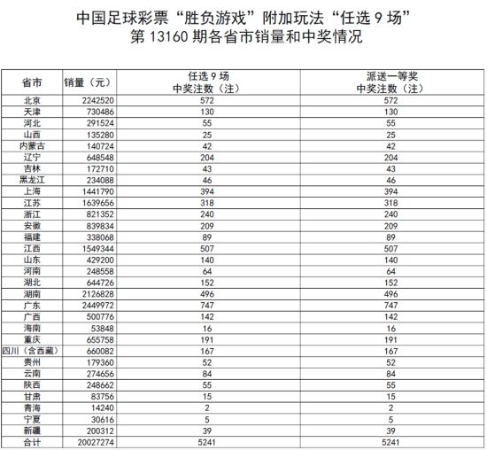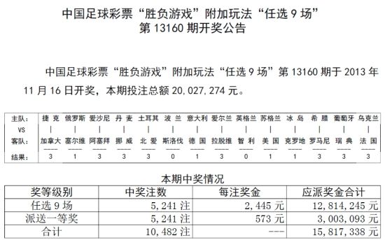 北京时间2013年11月16日,胜负彩13160期任九开奖结果揭晓:头奖5241注2445元,每注派奖573元,任九头奖总奖金为3018元。销量20,027,274元。新浪购彩平台方面,任九头奖中出429注,网友[北北单高手]8元巧擒头奖,实力非凡。[查看过关统计]