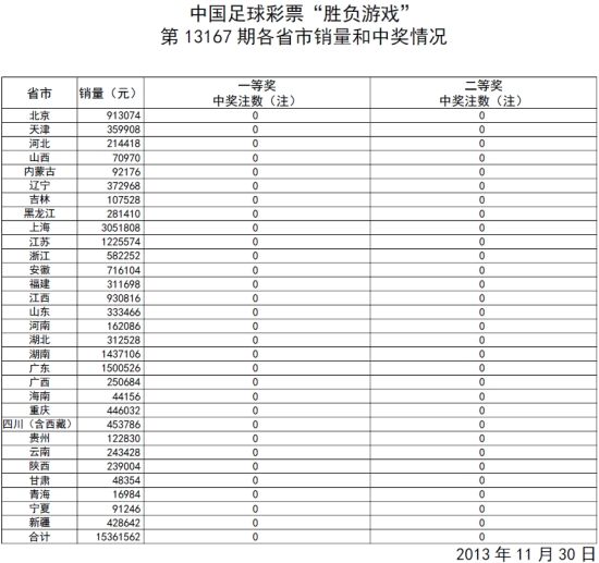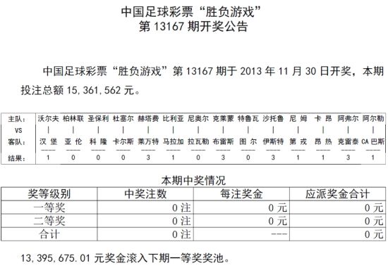 北京时间11月30日,胜负彩第13167期开奖揭晓:周五彩果小冷遍地,仅出4场主胜。结果全国无人命中12场以上,头奖和二等全部空缺,共13,395,675.01元奖金滚入下期一等奖奖池。任九中出50注181,921元。本期胜负销量15,361,562元;本期任九销量14,212,594元。