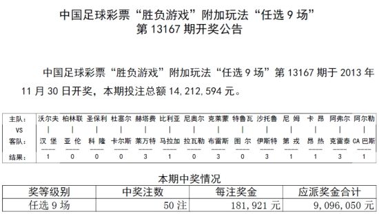 北京时间11月30日,胜负彩第13167期任九开奖揭晓:周五彩果小冷遍地,仅出4场主胜。任九头奖仅开出50注181,921元。如果全包任九花费39366万,也可以净赚14万元!新浪购彩平台方面,任九中出6注,分别被[舒梓巴巴]等6位网友分享。任九销量14,212,594元。[查看过关统计]