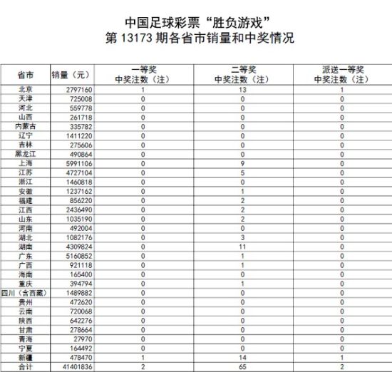 北京时间2013年12月8日,胜负彩13173期开奖结果揭晓:由于切尔西[微博]、多特等实力占优的球队纷纷输球,使得头奖仅头奖开出2注750万,二等奖65注122,294元,销量41,401,836万,854万元奖金滚入下期一等奖奖池。任九334注62673元,销量2801万元。[加奖继续 下期2元可中1000万!]