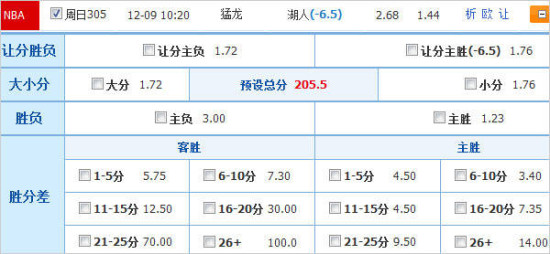 盘赔方面,湖人平均胜赔为1.39低于猛龙的2.76,竞彩官方为主客队分别开出1.23和3.00胜赔,后市走势上各家公司普遍给主胜降水,bwin初盘为两队同时开出1.91胜赔后,湖人主胜的最新赔率已大幅下降至1.38,而猛龙胜赔则上升至3.10,两队赔率形势变化如此之大,应当是受到了科比复出以及湖人力取国王的题材影响。湖人坐拥主场优势且战意相当强烈,紫金军团本场主胜悬念不大。让分方面,竞彩官方为湖人开出让6.5分,其中让分主负赔率为1.72略低于主胜的1.76,立博和18bet维持主队让5.5分初盘态度,bwin则在初盘开出主队让2.0分后调整至5.5分,本场湖人题材十足必定大热。猛龙近期连续四战全部输球输盘,球队状态低迷且后劲恐怕会明显不如湖人,本场看好湖人一举赢盘。大小分方面各家公司普遍开出205分至206分之间,后市上大小分赔率走势则略有分歧出现,竞彩官方开出205.5分,其中大分赔率为1.72同样略低于小分的1.76,立博和bwin都开出205分平手盘(bwin初盘开出202分,立博则是205.5分),10bet和18bet开出205.5分后的大分赔率则分别达到1.97和1.98,都高于同时开出的1.89的小分赔率。湖人在猛龙的糟糕防守面前机会不少,但猛龙面对重攻轻守的湖人也不大可能出现超低分,本场建议走大分为宜。