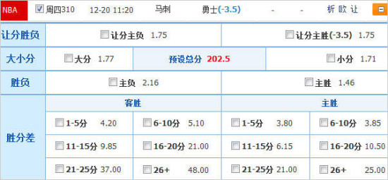 盘赔方面各家公司差异巨大,勇士平均胜赔为1.84和马刺旗鼓相当,竞彩官方为主客队分别开出1.46和2.16胜赔,对于勇士投注大热极为防范,如此示好主队应当是受到勇士近期大将复出后状态回升,而马刺客场背靠背作战、帕克突然伤停的影响。bwin初盘为主客队分别开出2.15和1.73胜赔,后市上则已经调整为2.10和1.77,bwin如此态度也有其重要理由,毕竟马刺阵容依旧相当稳定,而且近期交手已经保持三连胜。不过勇士占得体力和主场优势,火力一旦打开恐怕马刺也并不好防,本场勇士更值得一搏。让分方面,各家公司再度出现分歧,竞彩官方为勇士开出让3.5分浅盘,bwin初盘为主队开出受让2.0分后调整为1.5分,Betonline初盘为主队开出让2.0分后上调至3.0分,人员齐整的勇士在内外线并会不惧怕马刺,看好勇士赢下浅盘。大小分方面,竞彩官方开出202.5分,其中小分赔率为1.71高于1.77的大分赔率,bwin和betonline分别维持201分和204分平手盘的初盘态度,马刺的进攻力应当不会受到背靠背的太大影响,而勇士近期火力保持得相当稳定,本场建议走大分。