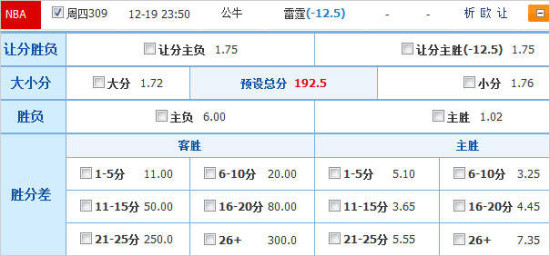 盘赔方面,雷霆平均胜赔为1.19远低于公牛的6.74,竞彩官方为雷霆仅开出1.02胜赔,公牛胜赔达到了6.00。bwin初盘为雷霆开出1.16胜赔,后市继续调低至1.10,公牛胜赔则由初盘的5.40大幅上升至7.50,各家公司对于雷霆主场强势题材做足防范。雷霆的状态相当稳定,而公牛在战意层面上恐怕也无法跟主队抗衡,雷霆主场13连胜当无悬念。让分方面各家公司出现明显分歧,竞彩官方为雷霆强势开出让12.5分平手盘,此分数与之前雷霆主队对阵湖人[微博]开出的盘口基本相同,bwin初盘开出主队让10.0分后大幅上调至13.0分,利记和18bet等维持主队让13.0分的初盘态度,YSB 88在初盘开出主队让10.0分反而是回落至8.5分。公牛连续疲惫作战状态堪忧,近期两次来到俄城场均也只有75分,球队在雷霆的攻击潮中极可能战意萎靡,本场看好强势雷霆一举穿盘。大小分方面,竞彩官方开出192.5分,其中大分赔率为1.72略低于小分的1.76,bwin初盘开出193.5后小幅调整为192分,利记维持192分的初盘态度,而YSB 88初盘居然开出207分并在最新盘变为208.5分,显然是受到此前雷霆对阵湖人狂砍122分的影响。然而公牛这支球队的进攻节奏和湖人明显不同,雷霆此战过后就将赶赴挑战马刺,相信本战会让主力得到足够休息。本场建议走小分为宜。