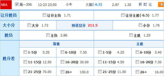 北京时间12月24日周二,NBA总计有11场比赛开打。其中火箭和热火[微博]坐镇主场,分别迎战同区对手小牛和老鹰。从赔率形势来看,竞彩官方为火箭和热火开出的胜赔分别只有1.23和1.11,两支人气球队有望主场胜出。【参与篮彩投注,支持你的主队】