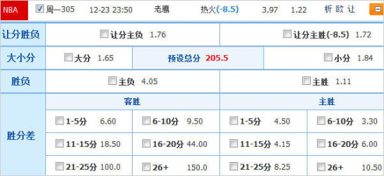 盘赔方面,热火平均胜赔为1.22低于老鹰的3.97,bwin初盘为热火和老鹰分别开出1.16和5.50胜赔,最新赔率则调整至1.22和4.50,数据层面上老鹰胜赔下降比较明显,看来还是对客队不俗状态略有防范。竞彩官方为主客队分别开出1.11和4.05胜赔,毕竟无论是球队形象还是账面实力,热火都要比老鹰高出太多,本场热火胜出正路仍是首选。让分方面,各家公司开始出现一定分歧,立博维持主队让8.0分初盘态度,bwin初盘开出主队让10.0分后回落至8.5分, YSB 88则在初盘开出主队让5.0分小幅上涨至6.0分。竞彩官方本场为热火开出让8.5分,其中让分主胜赔率略低于让分主负,本战是热火连续5个主场及圣诞前夕的最后一战,卫冕冠军有充足理由以大胜收场,本场建议走热火赢球赢盘。大小分方面,bwin、bet365、立博等维持204.5分平手盘,在热火主场极为强势的情况下开出如此分数,显然还是不太看好老鹰能打出流畅进攻。另外比较意外的是YSB 88虽然最新盘也开出204.5分,但其初盘达到了211.5分。竞彩官方本场开出205.5分和 主流公司差别不大,然而过往两队交手中双方连续6次打出小分,老鹰上一次来到迈阿密能得到100分以上,还得追溯至去年的1月份,老鹰进攻端起伏明显,本场建议走小分为宜。
