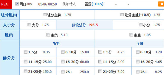 盘赔方面,雷霆平均胜赔为1.14明显低于凯尔特人的5.27,bwin初盘为主客队分别开出1.09和8.00胜赔,最新赔率已分别调整为1.14和6.00,centrebet维持主客队胜赔分别为1.15和5.35的初盘态度,后市上各家给客胜降水倾向明显,对雷霆背靠背作战、绿衫军爆冷胜出的题材略有防范。竞彩官方为主客队分别开出1.05和5.10胜赔,凯尔特人虽然体力占据优势且也有一定冲击力,但雷霆的抗压能力更值得信赖,看好雷霆主场止住2连败。让分方面,bwin初盘为雷霆开出让12.0分后降为11.0分,skybet维持主队让11.5分初盘态度,但让分主负赔率略低于让分主胜。竞彩官方为雷霆开出让10.5分平手盘,客队攻防两端的稳定性不足,主队只要保持相当火力当能成功退敌,不妨雷霆赢盘反弹。大小分方面,bwin初盘开出198分后降为194.5分,YSB 88维持194.5分初盘态度,都不期待两队能打出对攻。竞彩官方开出195.5分,绿衫军的客场得分能力不佳,本场不乏出现极低得分可能,建议走小分为宜。