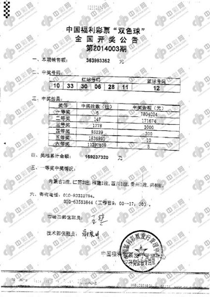 北京时间2014年01月07日晚,中国福利彩票[微博]双色球[微博]第2014003期开奖,当期奖号:红球06、10、11、28、30、33蓝球12。红球出现断二区,历史上003期断区概率达到66.7%,相当之高,本期开出也可算如约而至!本期头奖开出6注780万,分落5地,其中江苏独揽2注。本期投注额3.63亿元,奖池余额1.69亿元。[投注双色球 实现大奖梦]