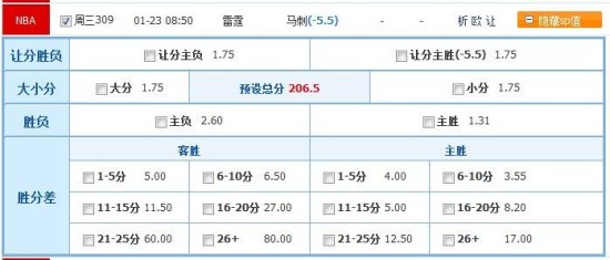 胜分差:客胜1-5/6-10分 大小分:大(206.5分)