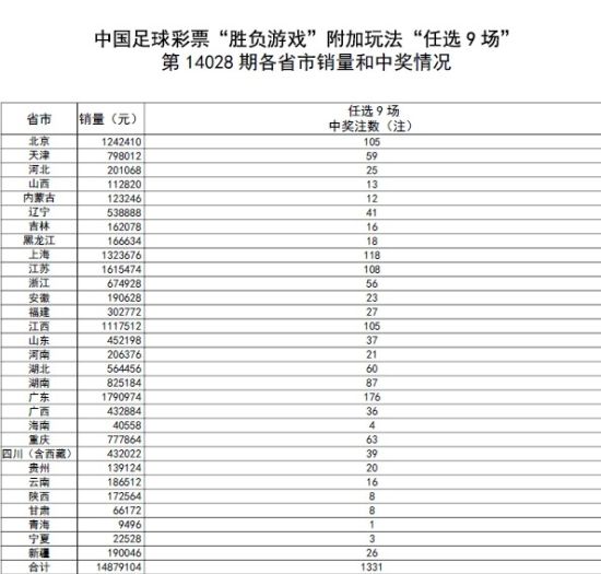 北京时间3月1日,胜负彩14028期开奖结果揭晓。本期足彩并没有产生大冷门,但是诸多小冷门扎堆出现还是带来不小的杀伤。任九头奖开出1331注,单注奖金7154元,销量为1487万元。