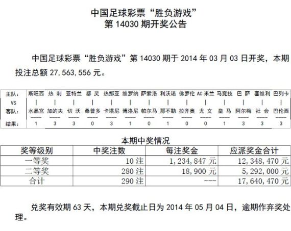 北京时间2014年3月3日,胜负彩第14030期开奖,本期没有大冷的比赛,一些小冷的出现让头奖开10注1,234,847元,新浪网友[电脑分析]收获1注,二等奖280注18,900元,投注总额为27,563,556元。任九头奖1891注8,277元,销量24,458,726元。