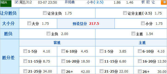 大小分:大分(217.5分) 胜分差:客胜1-5分/6-10分