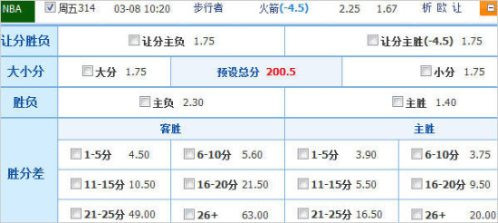 让分方面,立博、bet365和bwin同时开出火箭让3.0分浅盘,YSB 88开出火箭让0.5分,而利记更是在初盘开出0分生死盘后,反常地开出火箭受让5.5分,显然是不看好主队的攻坚能力。竞彩官方初盘为火箭开出让4.5分,对主队投注过热有所防范。火箭在主场和东区老大上演矛盾大战,攻击战意应当不会太差,本场看好休斯敦趁热打铁赢盘成功。