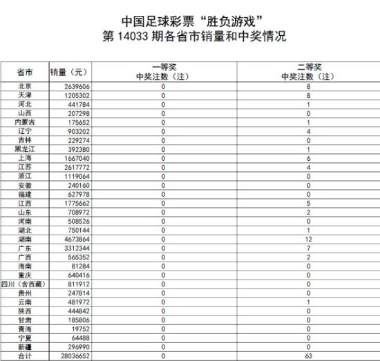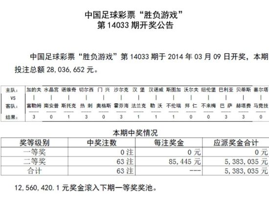 巴萨输球致头奖空开,1256万元滚存至下期!北京时间3月9日,胜负彩第14033期开奖结果揭晓,由于巴萨客场1球小负弱旅,爆出大冷,足彩头奖空开,二等奖63注,单注奖金85,445元,销量为2806万元,1256万元奖金滚入下期一等奖奖池;任九头奖240注,单注奖金为66,371元,销量为2488万元。[投注周日胜负彩抢滚存]