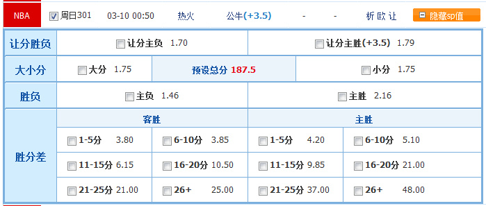 北京时间3月10日早晨NBA将进行9场比赛,火箭主场再迎强敌开拓者,连败的热火将客战克星公牛,雷霆将作客洛杉矶对战湖人[微博]。从当前赔率情况看,火箭有望再克强敌拿下西部第三争夺关键战,状态低迷的热火面对同样需要重回胜轨的公牛,盘赔优势不明显,或将有冷。[立即投注]