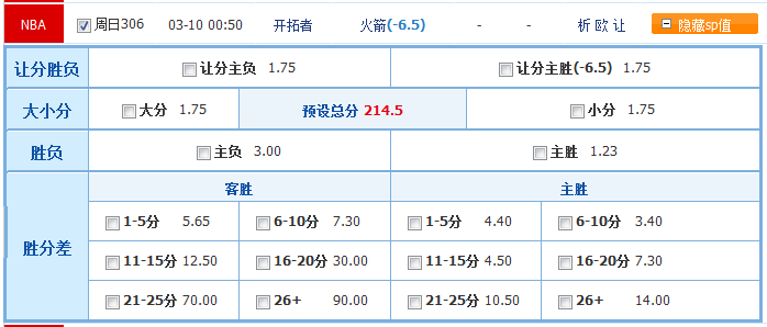 本场比赛竞彩直接开出火箭主让6.5分的优势盘,看似优势过大可能爆冷,但以开拓者近期的发挥和球员的状态来看,火箭要比开拓者好上不少。让分数据上多数公司开出火箭主让5分,竞彩的6.5分并不算太过,前期或将只是吸引下盘的投注,后市可能会退为5.5分,因此总体来看火箭基本面占优,盘赔热度适中。本场看火箭力擒竞争对手,巩固西部第三,走让分主胜。大小分开出214.5分,开拓者虽然节奏快,但近期火力不佳,火箭已经不再单纯的强调快速进攻,慢节奏打法一样打得有声有色,本场高盘下看小分。
