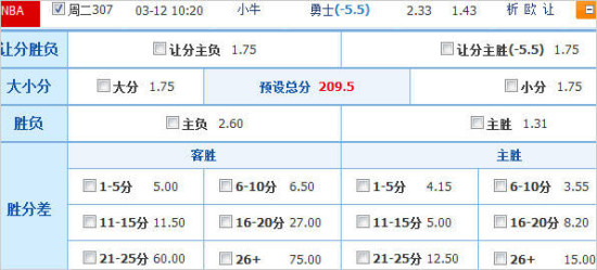 大小分方面, bwin维持初盘开出212.5分,比较关注两队大打对攻,毕竟勇士和小牛的球风也都偏向进攻。竞彩官方初盘开出209.5分,面对攻强于守的小牛,内外线实力均衡的勇士将有不错的得分机会,不妨看好两队打出大分。