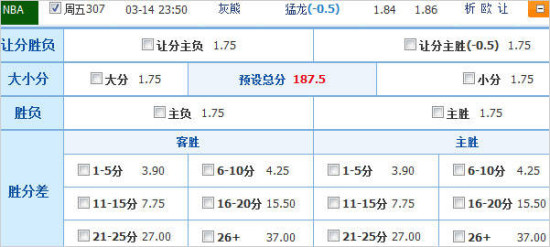 胜负指数方面,猛龙平均胜赔为1.84和灰熊的1.87相差无几,bwin初盘为主客队开出1.80和2.05胜赔,后市上调整为1.87和1.95。另外youwin、winner和bet3000等公司,都开出主客队相同的1.91胜赔。竞彩官方初盘为两队开出同样的1.75胜赔,让分盘则为猛龙开出0.5分极浅盘,也比较认可双方形势相当。猛龙和灰熊近期都是主场强势而客场偏弱,本场两队都是全主力出战,不妨直走猛龙依傍主场击退强敌。