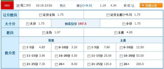 本场竞彩官方开出热火客让9.5分深盘,热火实力上的优势也展现无疑。亚盘各公司也根据两队近期的表现调整了让分盘,Bwin从6.5分升至9分,skybet让分8.5分,立即直开9分上盘低水盘,直接示好热火大胜。两队近期的走势上都是赢球赢盘,输球输盘,走势较为直接。近期骑士主场面对强队战绩不佳,且往季对阵热火已经九连败,综合考虑本场看热火客场大胜凯旋,走让分主负。大小分开出197.5分,骑士近来防守端乏力,热火进攻端看似小分多但多因为盘口开高,本场中高盘可信赖热火进攻端发威,直接强走大分。