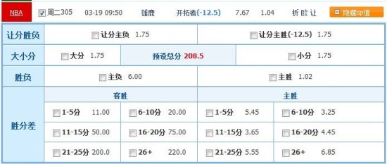 胜分差:主胜6-10/11-15分 大小分:小(208.5分)
