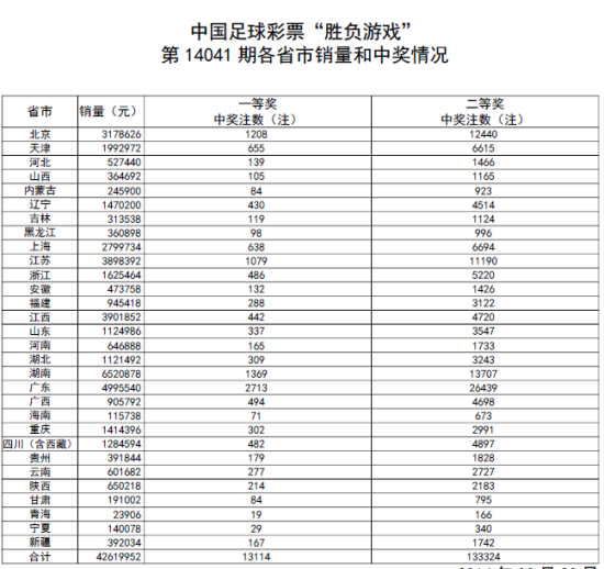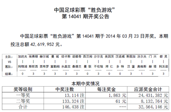北京时间3月23日,胜负彩第14041期开奖揭晓:本期冷意不足,强队皆胜,头奖13114注1863元,历史第8低;二等奖开13万多注61元,历史第7低。任九爆出40万余注,单注奖金42元。本期14场销量42,619,952元,任九销量27,119,640元。