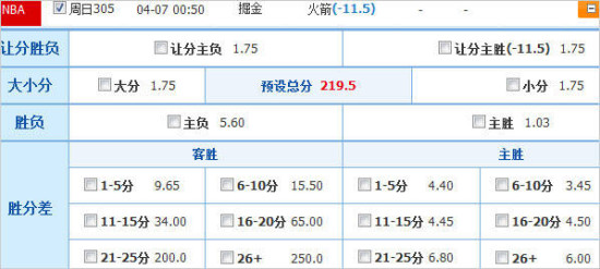 大小分方面,bwin由初盘的214分升至221分,centrebet和利记则是维持初盘的221分,各家公司普遍防范两队的对攻题材。竞彩官方初盘开出219分,显然也是看好火箭延续近期的强劲攻势。火箭面对掘金的稀松防守有望打出高分,而掘金现在虽然损失劳森,其后场的弗耶和火箭旧将布鲁克斯[微博],仍有一定的策动能力,此战建议强走大分为宜。
