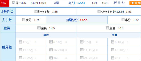 让分方面,立博、Interwetten、明升等开出湖人受让8.5分,18bet升至湖人受让9.5分,bwin则维持湖人受让11.0分初盘态度。竞彩官方为湖人开出受让10.5分深盘,其中让分主负赔率已降至1.65,火箭显然已经投注大热。尽管火箭此战过后将背靠背客战掘金,同时球队的稀松防守可能留给湖人机会,但哈登、林书豪等人的攻击力不容低估,不妨强走火箭大胜赢盘。