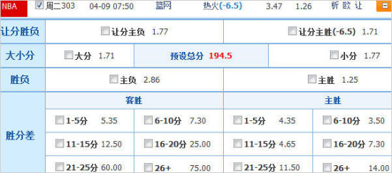 盘赔指数方面,热火平均胜赔为1.25低于篮网的3.49,后市上bwin保持主客队胜赔分别为1.32和3.50不变,但bet3000、youwin等普遍调低篮网胜赔,对客队近期的大好状态有所示好。竞彩官方初盘为热火和篮网分别开出1.23和3.00胜赔,最新盘调整为1.25和2.86,同时开出热火让6.5分并不算高,对篮网横扫热火略微防范。热火不仅存在拒绝横扫的需要,同时还渴望占住东区第一的位置,战意应当强于此前3次交手,看好热火乘胜追击成功赢盘。