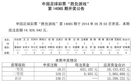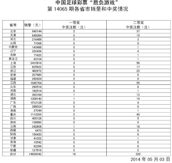 北京时间2014年5月3日,胜负彩14065期开奖揭晓:由于上期374万滚存,本期头奖开出16注652,102元;二等奖320注8955元,销量1492万。任九头奖1960注4235元,销量1297万。