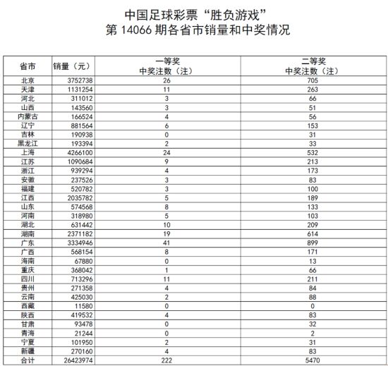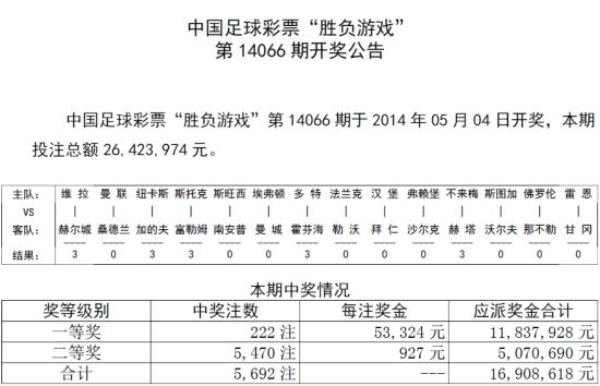 北京时间5月4日,胜负彩第14066期开奖揭晓:本期曼联主场输给桑德兰,可是足彩整体冷意仍显不足。头奖最终中出222注53324元,二等奖927元,销量2642万。任九头奖22675注531元,销量1882万。