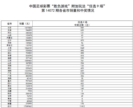 北京时间5月18日,胜负彩14072期任九开奖揭晓,马竞逼平巴萨夺得西甲冠军。任九头奖爆11,412注,单注奖金956元,销量1704万。新浪彩票投注平台任九场中出634注,其中[战神时代]独揽38注,另外还有8个ID获得10注以上,[joak22]72元小单中10注最为经典。