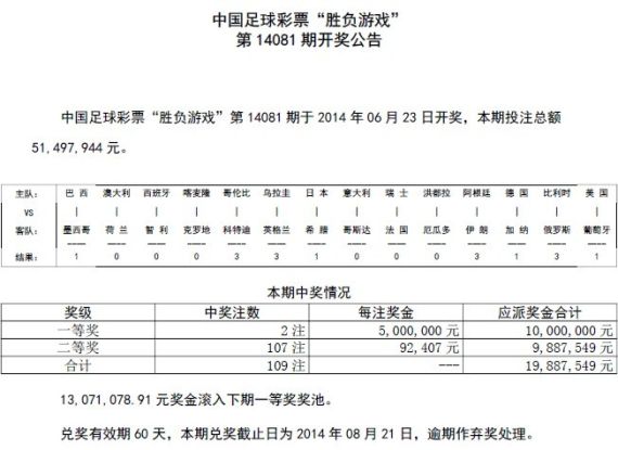 北京时间2014年6月23日,胜负彩14081期开奖结果揭晓:一等奖2注500万,13,071,078.91元存。二等奖107注,单注奖金92,407元,销量51,497,944元。任九场头奖450注37,233元,销量26,179,764元。
