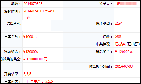世界杯热潮还在持续,延续着6月的中奖狂潮,爱彩7月刚开始高频彩便大奖不断,绝对是让人兴奋的好事。7月1日,会员[180*****]在快3中倍投和值玩法,狂揽40万;3日,另一会员[18****]在三同号单选玩法中独揽36万大奖,令人惊讶的是两份奖单中,会员都是采用单式倍投的方案投注奖号,最终命中当期开奖号,让人不得不感叹,好运来了真是挡都挡不住!在此,恭喜这两位中奖会员,祝所有会员大奖拿到手软。[马上一试身手]