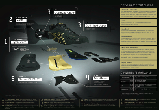 大约三年前,ASICS亚瑟士人体工学研究所所长Tsuyoshi Nishiwaki与他领导的团队努力不懈地工作着,希望发现他们所渴求的突破性新技术与材料。他们从零开始,一步步设计并调整化合过程中的每一个细节,突破性发现体现在以下四个方面: