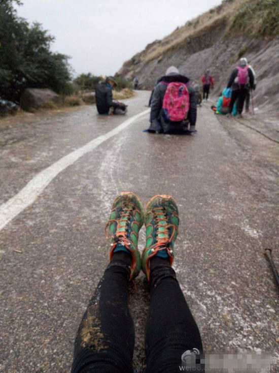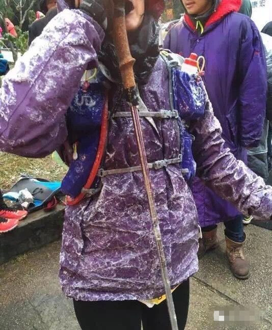 一个香港本地跑友看见了我,好心地要我跟他后面走,说他认识路。我跟在后面没2分钟,又一次滑行了出去。等我被扶起来,香港跑友不见了。我又偶遇上一个南京跑友,跟他后面跑了50米,可恶的路面又让我人仰马翻,等我起来,南京跑友也不见了,呜呜,好衰。经过三次摔跤,跑友都不见了,只留下我孤身一人行走在冰天雪地里,步步惊心!突然天空下起一阵特别大的冰雹,一下子,我的衣服全部冻起来了,硬生生的。本来帽子还需要靠手拽着才能不被吹走,这下子冻起来不用拽了。眼镜上全部冰雪,手套登山杖无一例外,全部成了速冻饺子!忽然紧接着狂风大作,我担心吹倒吓得蹲下身,背对着风雪。拿出电话,第一反应:打电话给后面的2个好友,要他们放弃上大帽山,太危险!可是电话怎么打也打不通。我失望了,蹲在那脑中一片空白!