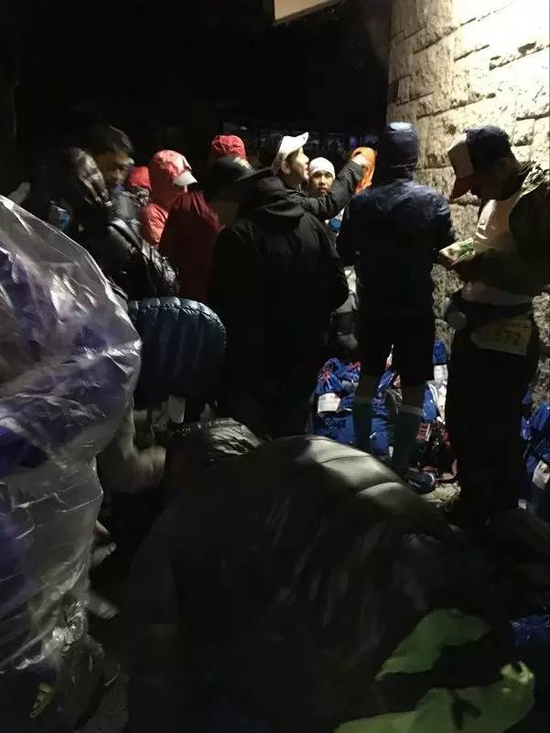 深圳美女张健(与我在大鹏马拉松同为官兔结识的美眉),说会在CP5那给自家跑友做私补,我们约好在CP4下坡临近CP5拥抱,赐我力量。可惜我下坡冲得太快,忘记这茬了,想回去找她又怕耽搁时间,只好怏怏来到换装点。其实在路上我就一直纠结,到了这个点要不要换衣服。换,要牺牲20分钟时间。不换,夜里凉身上的衣服有汗会冷。我快速做出决定:换!之前老听人说,经常有人在此找不到寄存包而退赛。所以有点害怕会遭如此厄运。事实不然,2分钟,他们就找到了我的包包。举目望去,没有换衣间。于是快速扎进洗手间,换上了第二套奔泰压缩衣。干爽的衣服好舒服,立即觉得牺牲这些时间是值得的。前半程52公里,本打算用8小时完成的,结果因为跑得太保守,欲留体力在最后发挥,却花了9小时多,由于没有手表计时,所以一直跟着感觉盲跑!