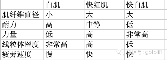 我们的肌纤维大体上可以分成3大类,根据他们的运动表现分为:慢肌(红肌)、快红肌和快白肌。他们在所有肌肉运动中都会同时发力,但是不同的力量、速度和时间的运动,这三种肌纤维参与的百分比会有非常显著的差异。他们的一些特点可以看下面这个表。