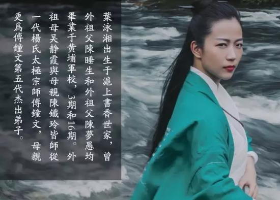 叶泳湘3岁学习太极拳,8岁-12岁曾修习少林,故能融汇外家内家,对太极有独到理解。很多武林中人都退隐江湖,而叶泳湘却要做网红,对此她的解释是“武林已经和从前不一样了,隐于江湖,要么功成身退,要么心灰意冷。”