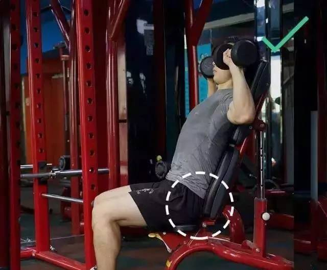 △臀部紧贴靠背,保持腰背竖直,让发力更多集中于肩部三角肌前侧。