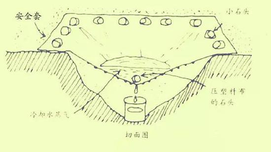 3、取水器:在沙漠、原野或丛林中,没有丰富水源时可用此法。夜晚前在地上挖一小坑,坑中央放一容器。