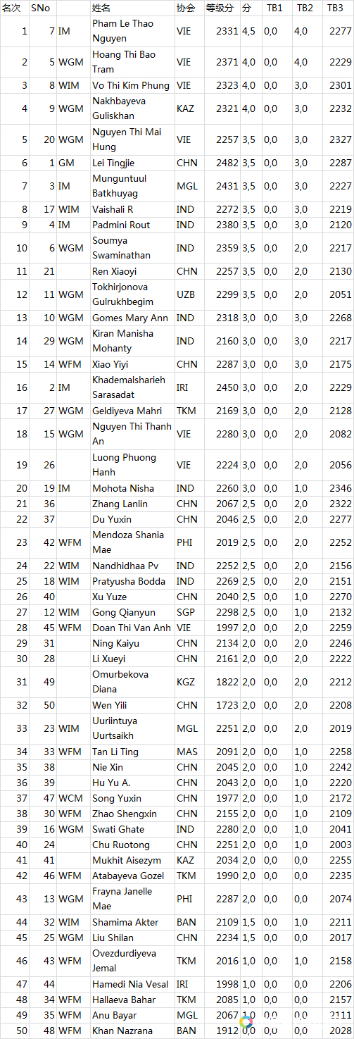 女子组方面,越南小姐妹集体发力。积分榜的前5名,只有一位哈萨克斯坦的棋手排在第4,而中国名将雷挺婕因为今天再和一场,名次跌至第6。任肖伊与印度棋手奕和,在第11位上和雷挺婕遥相呼应。胡聿、文奕力、聂昕等人取得胜利。