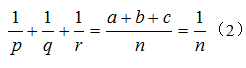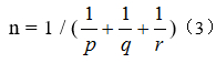 n = 1/ (1/p + 1/q + 1/r) = 1/(1/4.30 + 1/3.45 + 1/1.65) ≈ 0.885